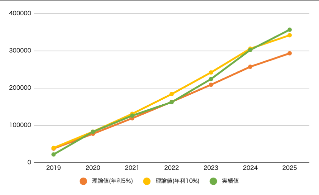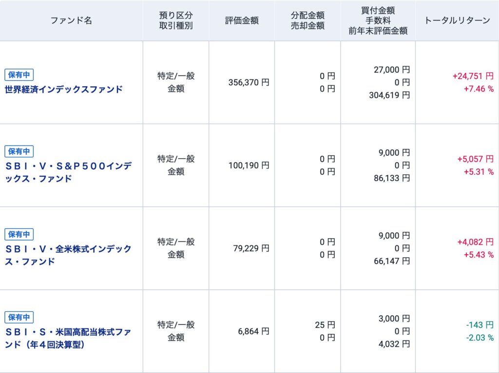 2025年のトータルリターンはプラス24751(7.46%)です。先月からさらに上昇しました。上がり方にびっくりしています。ただし、油断できるわけではなく、今後の動向次第では下がっていく可能性があることを忘れてはいけませんね!