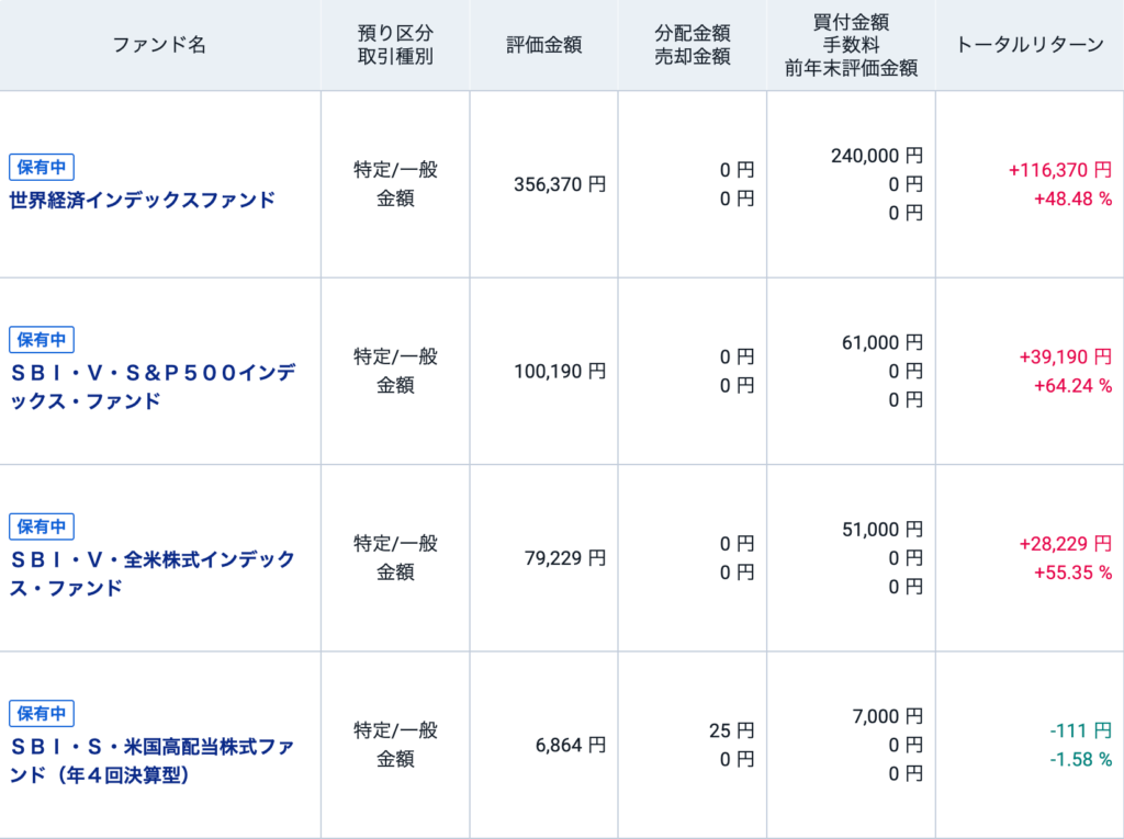 これまでの各年リターンを参考までにまとめました。2022年以外はプラスです。2023年は投資期間で最高値でした。こうしてみると、世界的に感染症が流行した2020年でプラスなのに、2022年の方がマイナスで影響度が大きかったのは意外な感じですね。