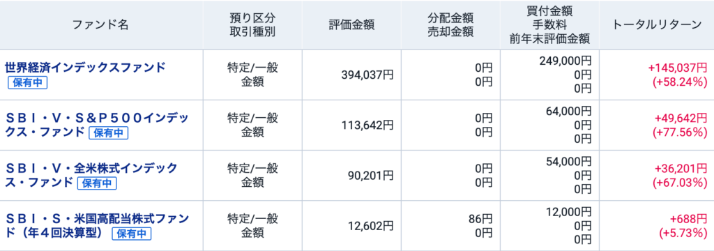 これまでの各年リターンを参考までにまとめました。2022年以外はプラスです。2023年は投資期間で最高値でした。こうしてみると、世界的に感染症が流行した2020年でプラスなのに、2022年の方がマイナスで影響度が大きかったのは意外な感じですね。
