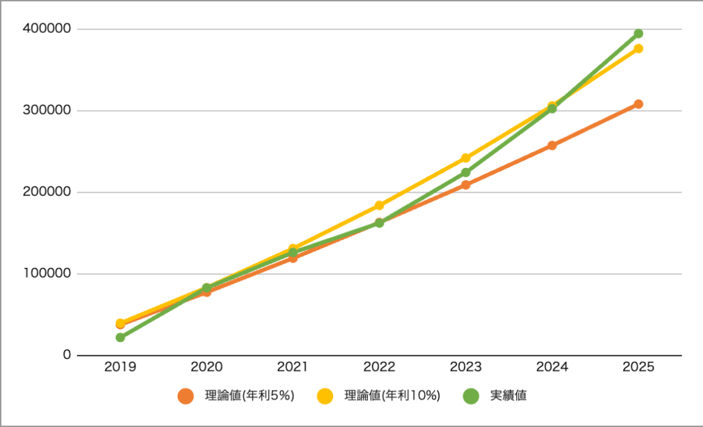 毎月3000円積立を7年間継続した運用結果を年利で計算し、理論値(年利10%と5%)と実績値を比較しました。グラフは「三井住友TAMー世界経済インデックスファンド」になります。